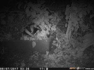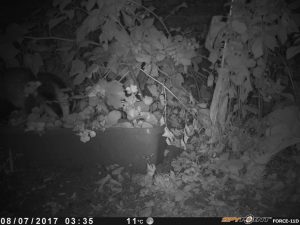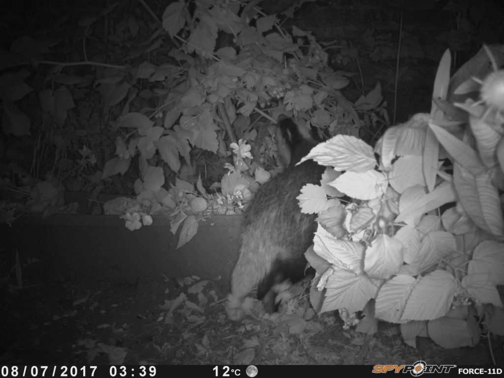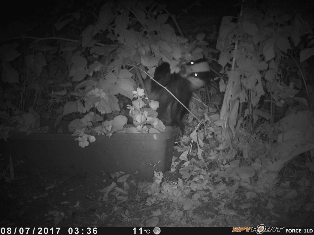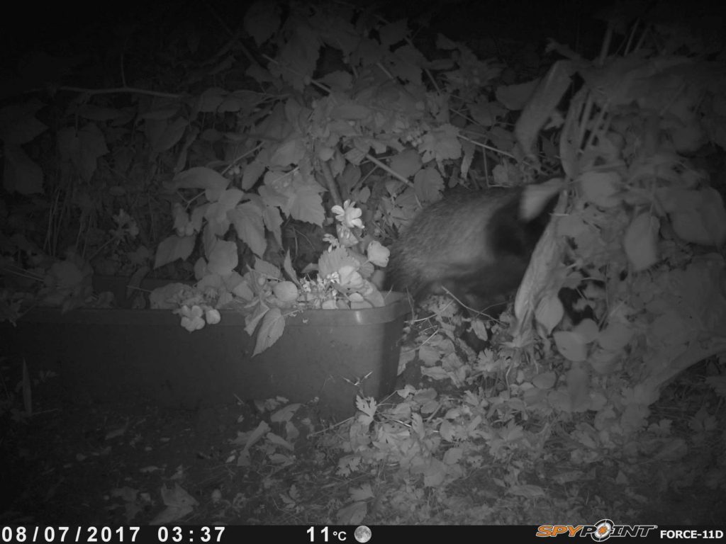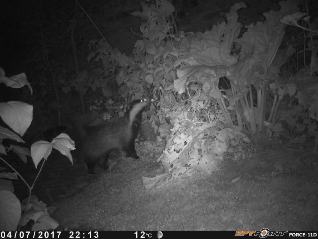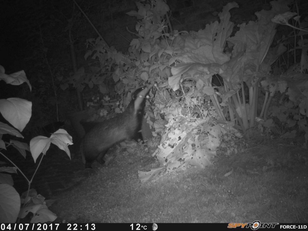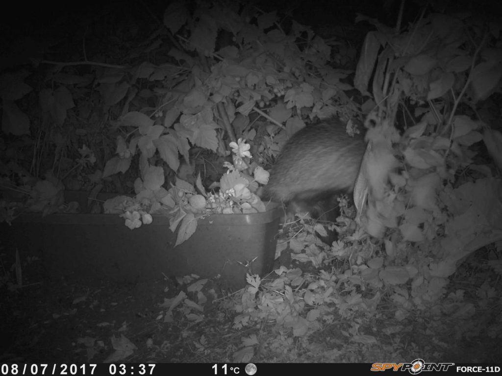 Badgers usually get into back gardens by burrowing under fences. One of them must have got lost in #2 last week as it broke out again through the back gate! We set the wildlife camera to watch for it, and found that badgers have a taste for raspberries!
